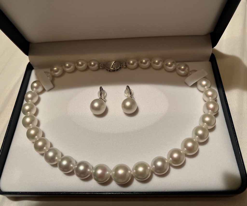 本日、待望の白蝶真珠のストランド(連)とイヤピアが入荷しました! 無キズで真円の白蝶真珠には圧倒されます…。31珠(11.9-15.2ミリ)の綺麗なグラデーション。クラスプは、シルバーではなく、なんとK14WGのダイヤ💎入り。イヤピア(イヤリングとピアスの両方使えるタイプを言う)も、K18WGのダイヤ入りで、特別仕上げで注文しました。全てをこだわって、本物だけで作ったストランドとイヤピア…。大満足な出来上がりに、新たなビジネスが加速してゆく予感がしてワクワク😄します。