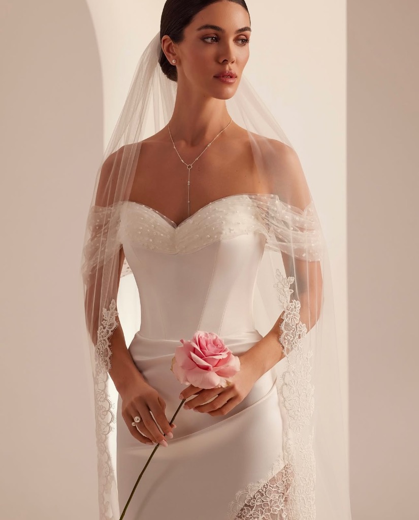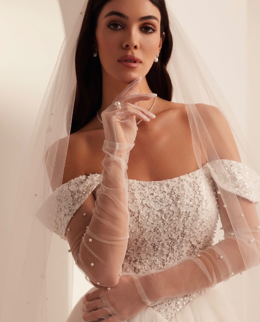 こんなシンプルで上品なウェディングドレスには、白蝶真珠だけをミニマルにチョイスして‼︎