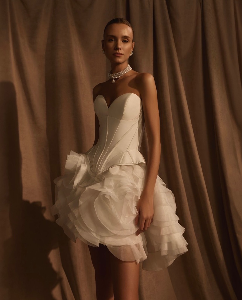 こんなミニのウェディングドレスは、ため息が出る程素敵💓。脚に自信がある花嫁には、是非ともチャレンジしていただきたい‼︎ ジュエリー💎はミニマムに!そして本物だけを‼︎ ラグジュアリーな花嫁様の出来上がりです❣️