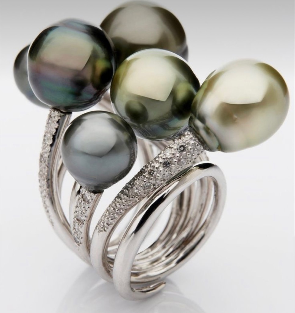 黒蝶真珠なのに、華やかさがあるリングです。蓬色が効いていて素敵‼︎ 地金はゴールドではなく、プラチナ色が黒蝶真珠の珠の色味としっくり合っていて、クールな印象。華やかさの中にも品が感じられる……。こんなリングを日常につけたいです。